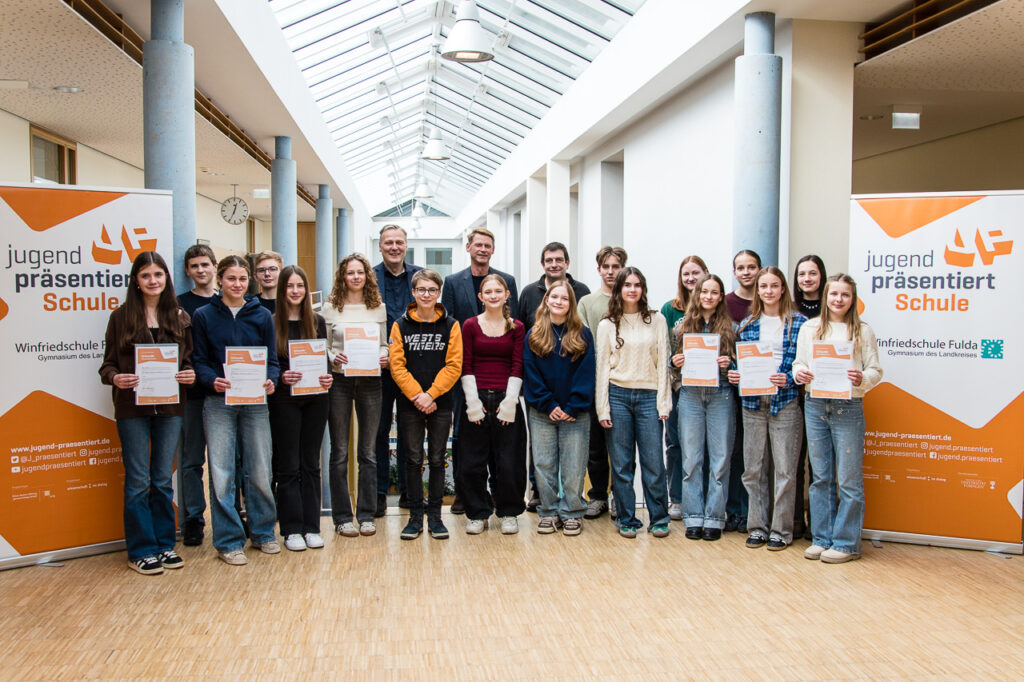 Wie die letzten Jahre auch, veranstaltete die Winfriedschule ein Schulfinale im naturwissenschaftlichen Präsentieren. Die Aufgabe: innerhalb von 5 Minuten eine naturwissenschaftliche Fragestellung interessant, fachlich richtig und überzeugend vor einer dreiköpfigen Jury zu präsentieren. Alle Schülerinnen und Schüler der Jahrgangsstufe 8 und der MINT-Kurse aus den Jahrgangsstufen 9 und 10 bereiteten sich seit August auf diesen Wettbewerb vor. In einem Projekttag lernten sie, wie man eine PowerPoint überzeugend gestaltet, wie man sicher vor einer Klasse steht und richtig recherchiert. Die jeweils klassen- bzw. kursbesten Präsentationen waren eingeladen, im kürzlich stattfindenden Schulfinale gegeneinander anzutreten und einen der vier begehrten Plätze im Landesfinale von Jugend präsentiert zu ergattern.