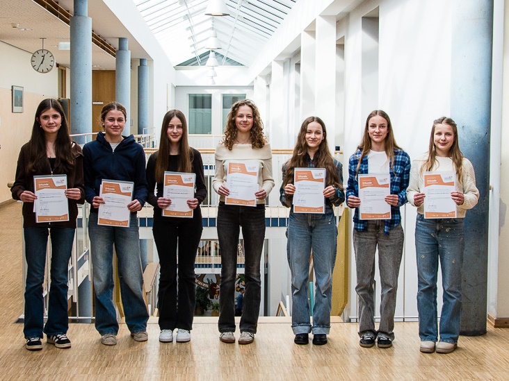 Diesmal gab es gleich zwei Schulsiegergruppen: Merle Jahn und Lotta Weßler aus der Klasse 8FL2 sowie Rebecca Klier und Cara Reiff aus der Klasse 9FL1 teilten sich den ersten Platz mit ihren Fragestellungen: Wie entstehen Polarlichter, bzw. warum schlägt das Herz schneller, wenn man aufgeregt ist? Ida Krack aus der Klasse 8F fragte sich, warum man friert, wenn man aus dem Wasser kommt und belegte damit den dritten Platz. Was beim Träumen in unserem Gehirn passiert, klärten überzeugend Lena Götz und Lilli Kramm aus der Klasse 9FL1 und konnten damit ebenso in das Landesfinale einziehen. Dieses findet am 24. Und 25. April in Dreieich statt. Über den begleitenden Videowettbewerb konnten sich außerdem noch Jakob Kiel und Benjamin Faulstich (beide Klasse 9FL1) mit ihrer Präsentation über die Kommunikation von Walen für das Landesfinale qualifizieren. Überzeugen die Finalistinnen auch dort, geht der Weg weiter ins Bundesfinale nach Berlin.