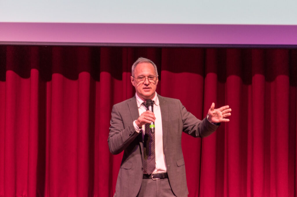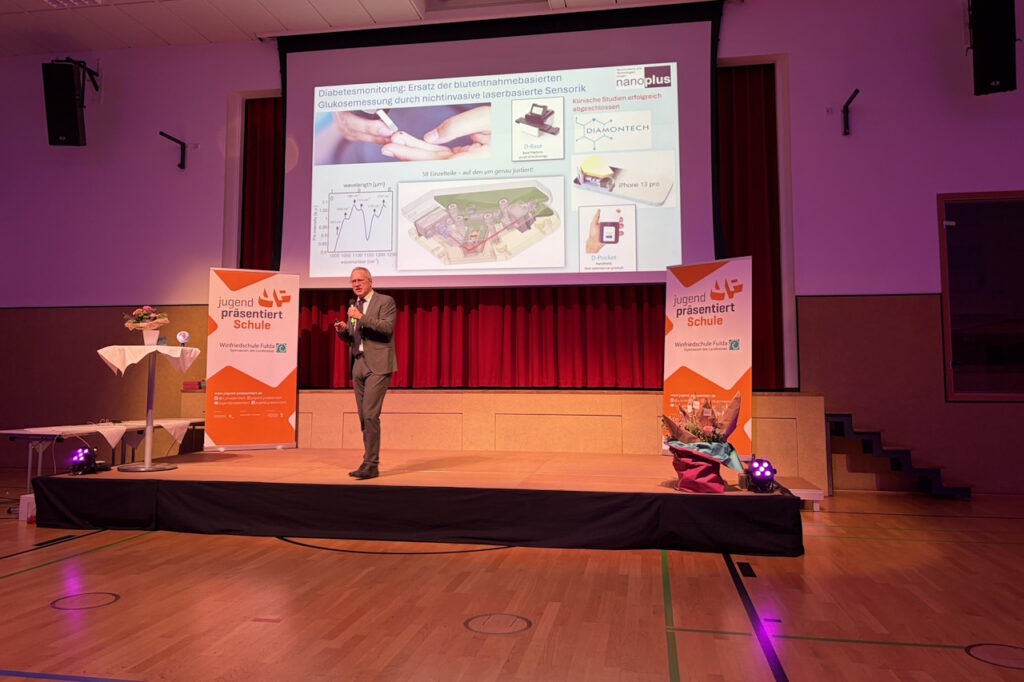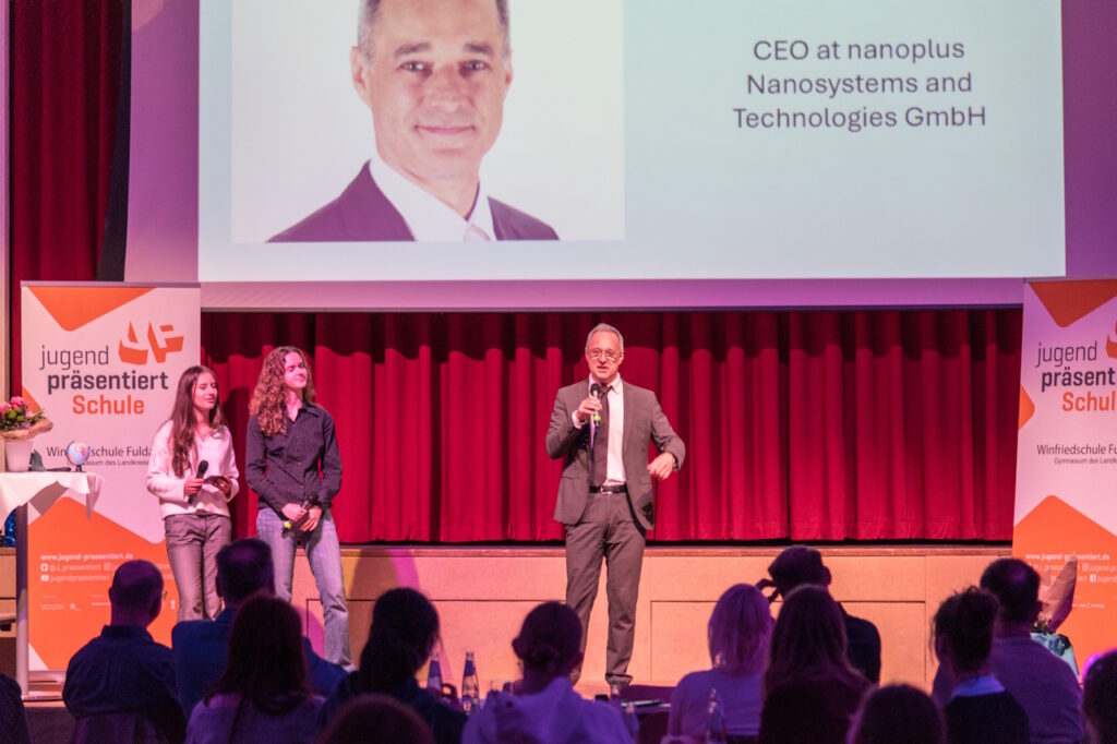 Adele Bhandari, Lisa Schmitt und Noemi Will begrüßten herzlich alle Gäste und führten souverän und kurzweilig durch das abwechslungsreiche Programm. Ein Interview mit dem ehemaligen Winfriedschüler Dr. Johannes Koeth bildete dabei den Anfang. Luise Köhne-Volland und Julia Kimmel stellten Fragen zu seiner „aktiven Zeit“ als Winfriedschüler sowie seiner Rolle als Firmengründer und Geschäftsführer der Firma nanoplus. Dabei erinnerte sich Dr. Koeth an seine ehemaligen Physiklehrer, Herrn Klemm und Herrn Hosenfeld, die ihn nachhaltig prägten. Der Vorschlag der Geschäftsgründung kam von seinem Professor während einer gemeinsamen Autofahrt, teilte Dr. Koeth schmunzelnd mit. Im anschließenden, kurzweiligen Vortrag fasst er die Idee des Unternehmens zusammen: Im Zentrum steht die Produktion von Lasern, die mit einer von ihm erfundenen Technik in beliebigen Wellenlängen einsetzbar sind. Mittlerweile bietet er über 150 Mitarbeiterinnen und Mitarbeitern in den Standorten Meiningen und Gerbrunn hochqualifizierte Arbeitsplätze. Die nicht einmal stecknadelgroßen Laser werden rund um die Welt verkauft und kommen in den Branchen Prozesskontrolle, Umwelt, Medizin und Forschung zum Einsatz. Besonders stolz sei er, dass seine Laser sogar im Marsrover herumführen. Abschließend ermunterte Herr Dr. Koeth die Schülerinnen und Schüler, mit MINT-Wissen ihr Leben, so wie er, auch beruflich zu gestalten. MINT böte die Chance, neugierig Fragen zu stellen und diese auch zu lösen.