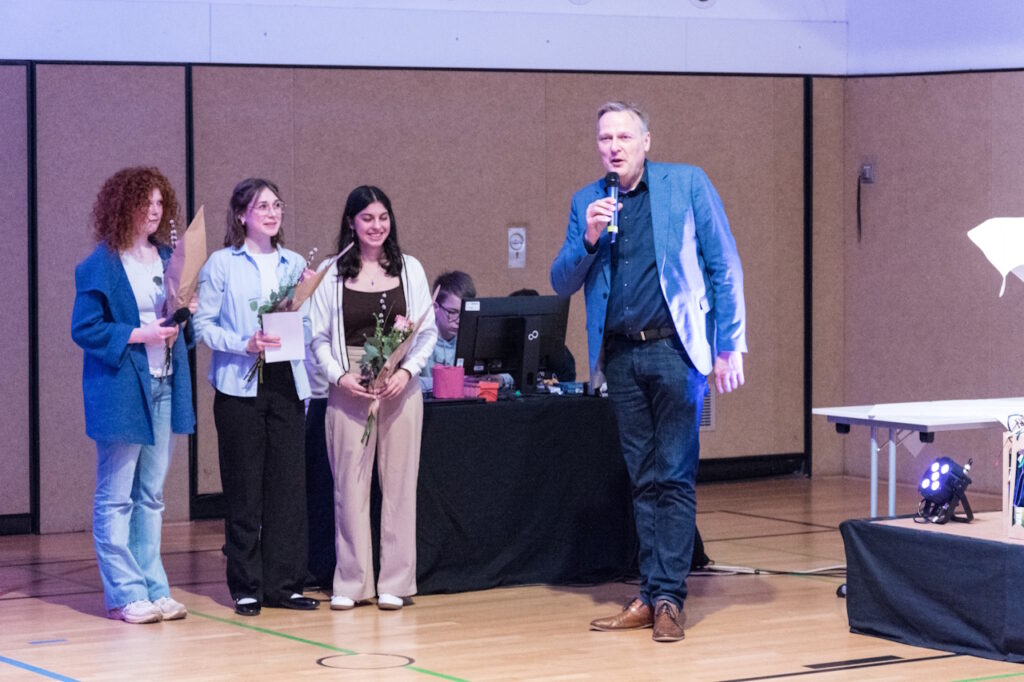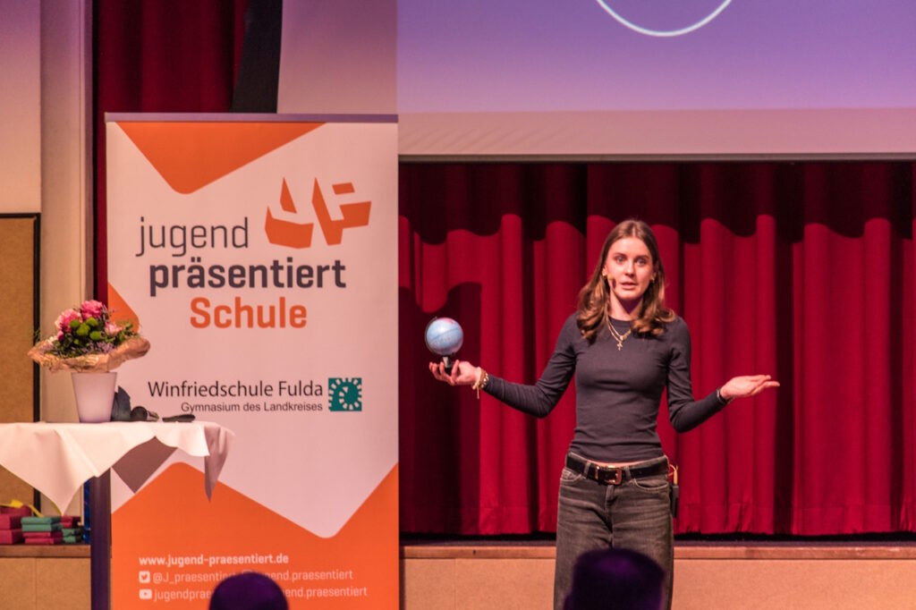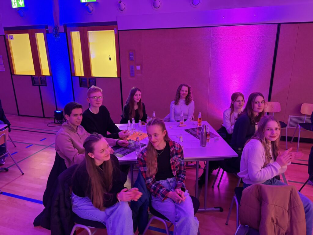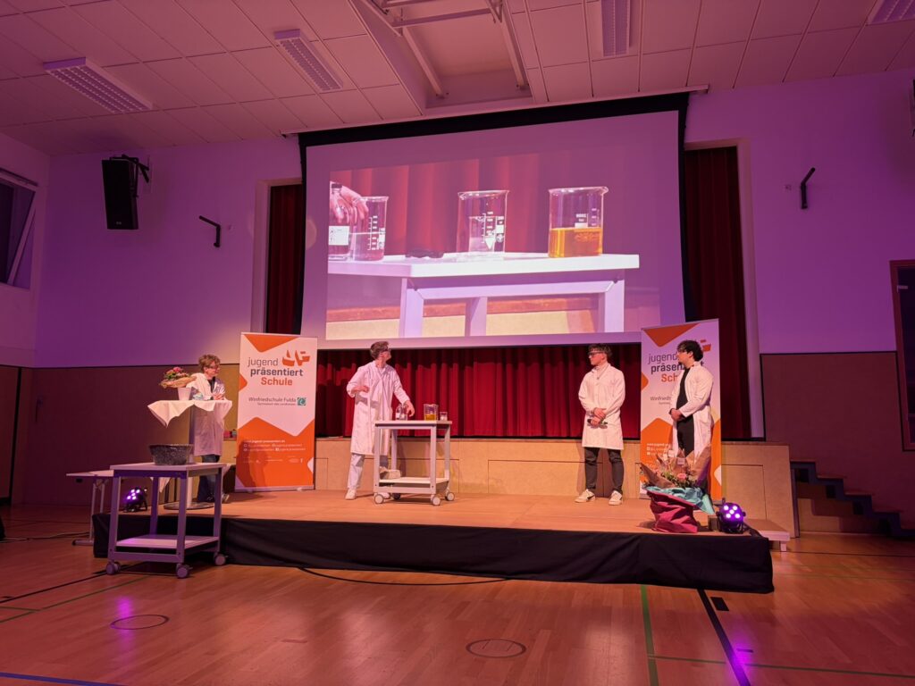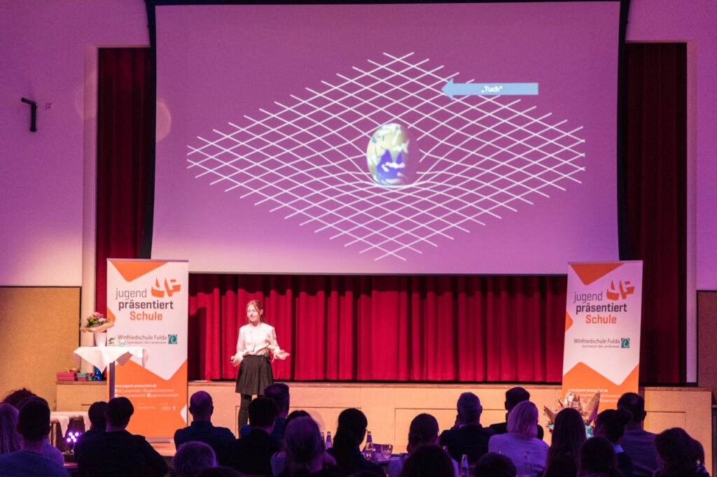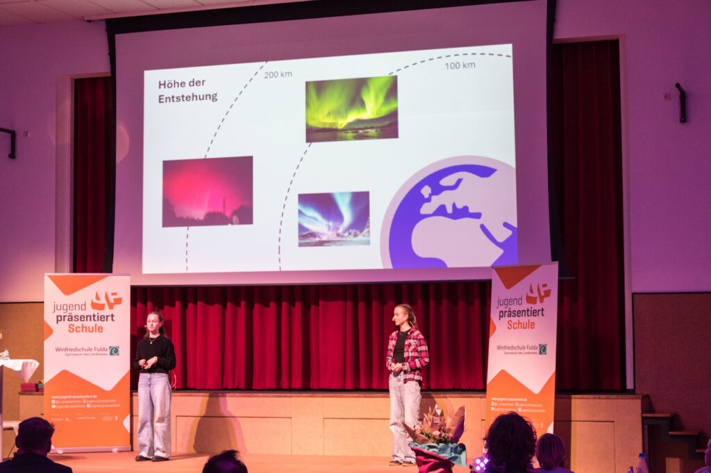 Den Abschluss der Veranstaltung bildeten zwei Präsentationen aus der Physik. Livia Rupp, Drittplatzierte im Bundesfinale von Jugend präsentiert, klärte dabei die Frage, wie die Zeit im Weltall vergeht und verblüffte die Zuhörerinnen und Zuhörer damit, dass man jünger werde, wenn man sich nur schnell genug bewege. Merle Jahn und Lotta Weßler, die das hessische Landesfinale 2026 von Jugend präsentiert erreicht haben, widmeten sich der interessanten Frage, wie Polarlichter entstehen. Mit einer erstaunlichen Ruhe und Souveränität erläuterten sie, wie Teilchen aus der Sonne die Moleküle der Luft zum Leuchten anregen und es so zu den vielen bunten Erscheinungen am Himmel kommt.
