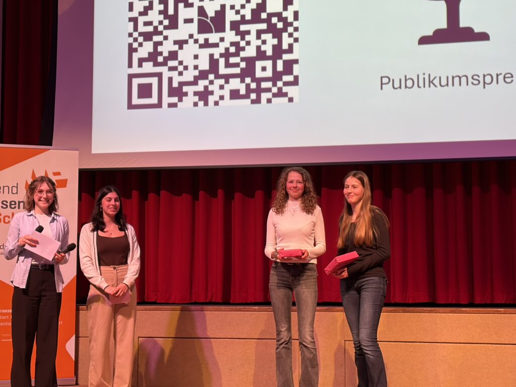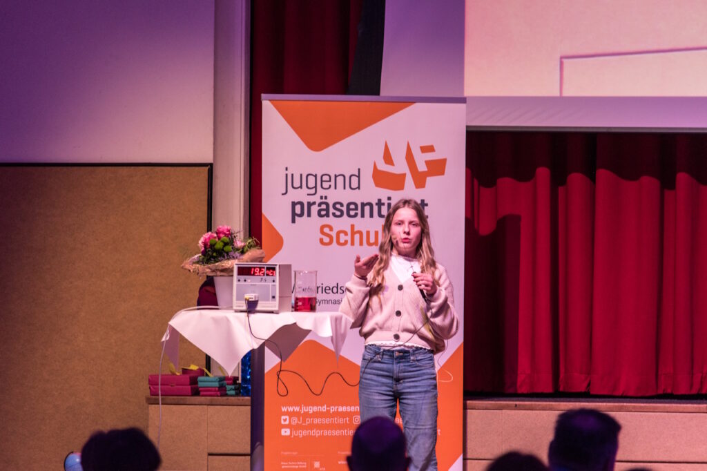 Genau das wiederum konnte das Publikum unmittelbar miterleben. Die Schülerinnen und Schüler präsentierten nun die Klärung von Fragen aus dem MINT-Bereich. Den Beginn machte Henriette Drechsel, die mit ihrer Fragestellung: „Woher wissen wir, wie weit ein Stern entfernt ist?“ letztes Jahr im Bundesfinale von Jugend präsentiert den 4. Platz erreichen konnte. Cara Reiff und Rebacca Klier, Finalistinnen im hessischen Landesfinale von Jugend präsentiert, erklärten dem Publikum in einer eindrucksvollen Präsentation, wieso das Herz schneller schlägt, wenn man aufgeregt ist, und konnten sich damit in die Herzen des Publikums reden, denn diese Präsentation gewann am Ende den Publikumspreis aller Präsentationen des Abends.