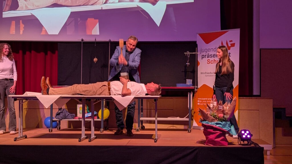 Wer meint, dass Physik oftmals langweilig und „staubig“ sein muss, der wurde an diesem Abend eines Besseren belehrt. Philip Simon und Jakob Kiel ließen einen Aluminiumschmetterling schweben und lenkten einen Wasserstrahl mithilfe eines Luftballons ab. Helena Bräscher und Johanna Brang erklärten zusammen mit Rebecca Klier und Cara Reiff den Unterschied von träger und schwerer Masse. Dabei zeigten sie in einem Experiment, dass ein Zeitungspapier härter sein kann als eine Holzleiste. Besonders eindrücklich jedoch war, als der Schulleiter Herr Müller mit einem Holzhammer auf den Oberkörper des Physiklehrers Lindenthal schlug – jenem dabei jedoch nichts passierte. Die träge Masse von 40kg Blei verhinderte Schlimmeres.